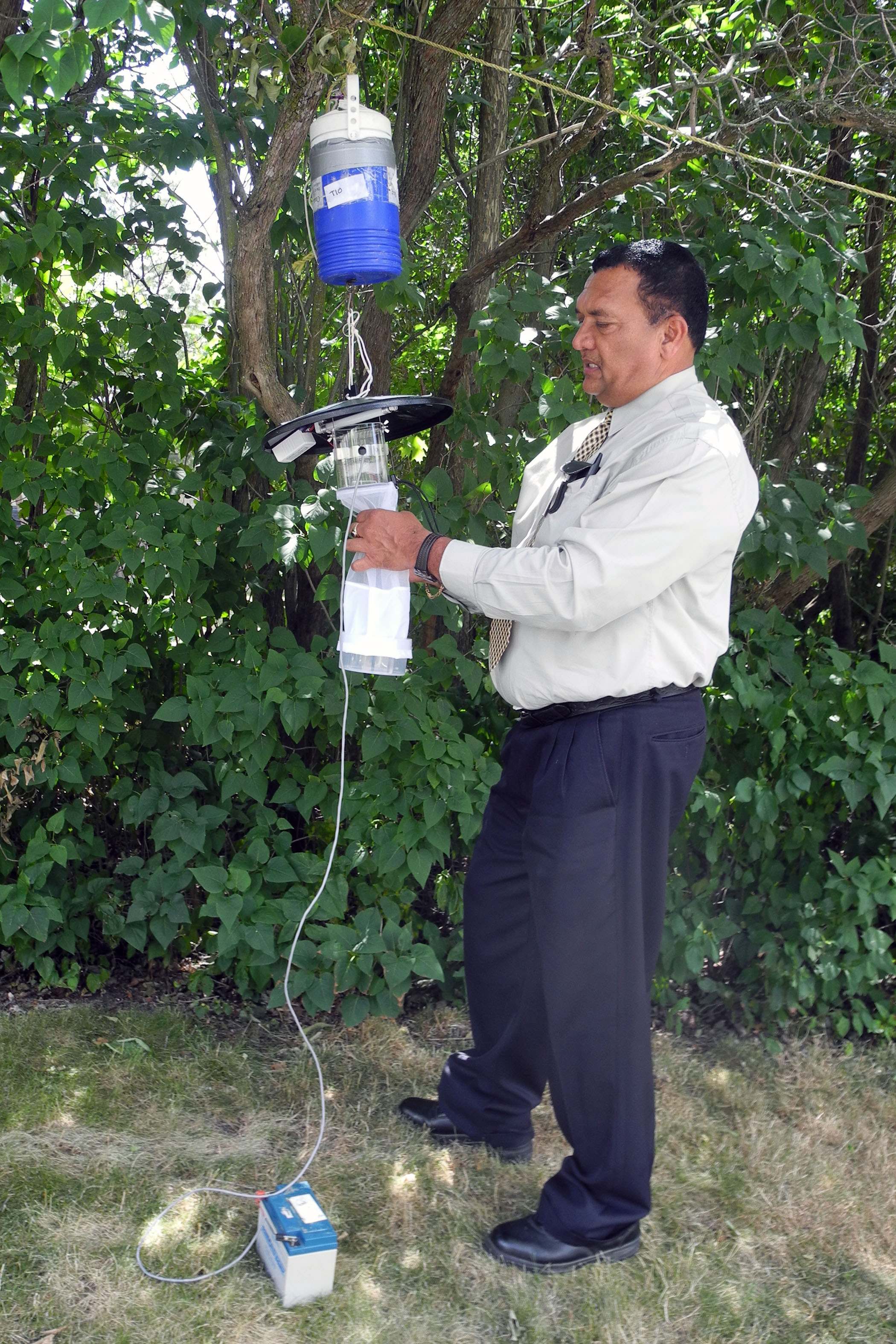 westnile July 25, 2012 at 12:39 pm BELLEVILLE (25/07/12) Aptie Sookoo, public health inspector with the Hastings and Prince Edward Counties Health Unit, sets up a mosquito trap on Queen St. in Belleville. Photo by Kristen Oelschlagel. Print This Post