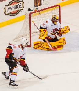 BELLEVILLE, Ont. (09/11/2013) – Belleville Bulls goalie Charlie Graham, 31, gets a glove on the puck and makes the save. Photo by Matthew Desouza.