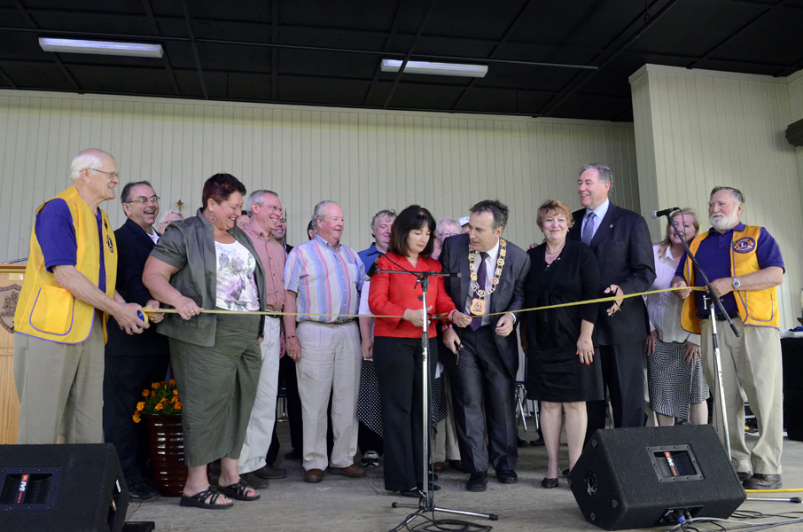 BELLEVILLE ONT (12/06/2011)- Special guests including Mayor Neil Ellis, MPP Daryl Kramp, and MPP Leona Dombrowsky join members of the Lions club, city council, and committee members to cut the opening ribbon. The group was celebrating the opening of the Lions Pavilion Zwicks Park. The new pavilion will provide shelter during shows. Photo by Linda Horn