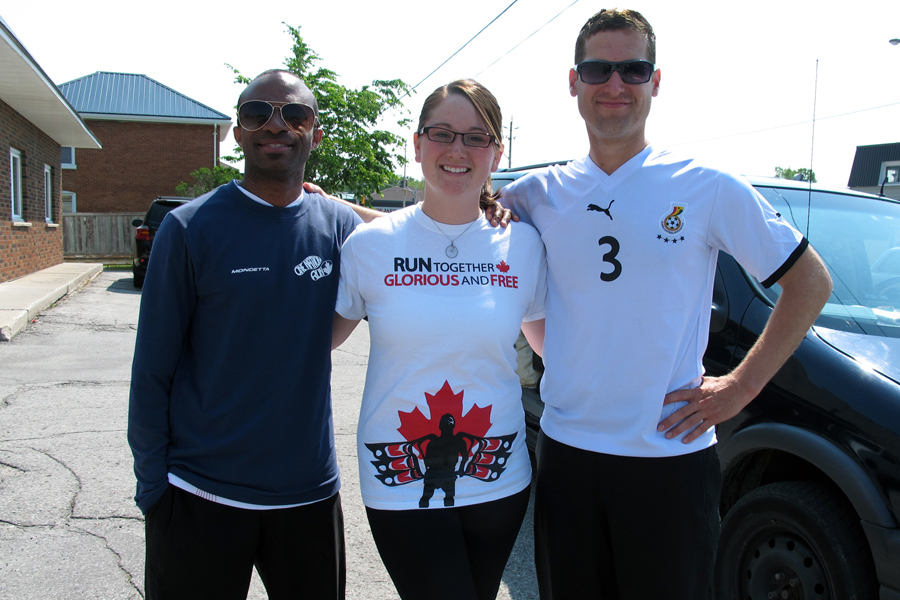 BELLEVILLE, ON (15/06/11) Sponsored by World Vision, left to right, Zaya Kuyena, Brittany Dickson, and Bryce Dymond are running across Canada in a 71km per day relay. They hope to hit British Columbia by September and raise over $200,000. Photo by Steph Crosier