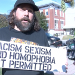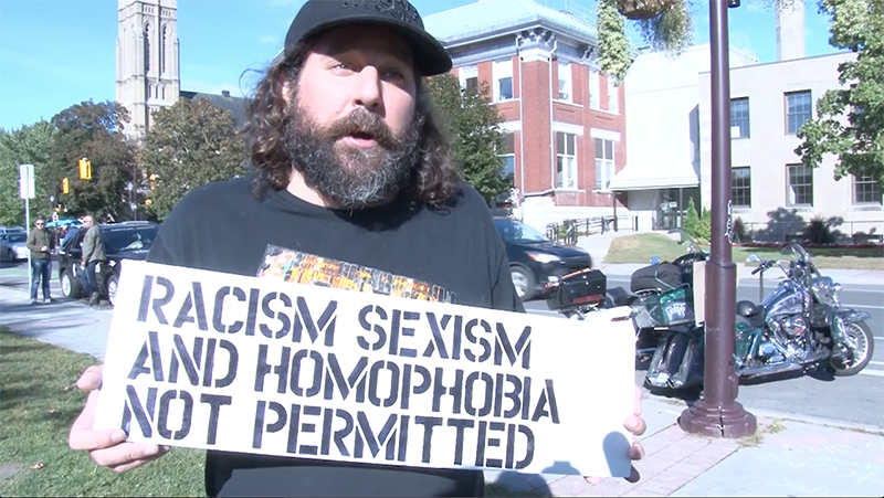 Jeremy Bertrand, a Peterborough resident and graffiti artist, who opposed the anti-immigration rally, said he wanted to send a clear message, using a homemade sign he made himself which read: Racism, sexism, and homophobia not permitted.