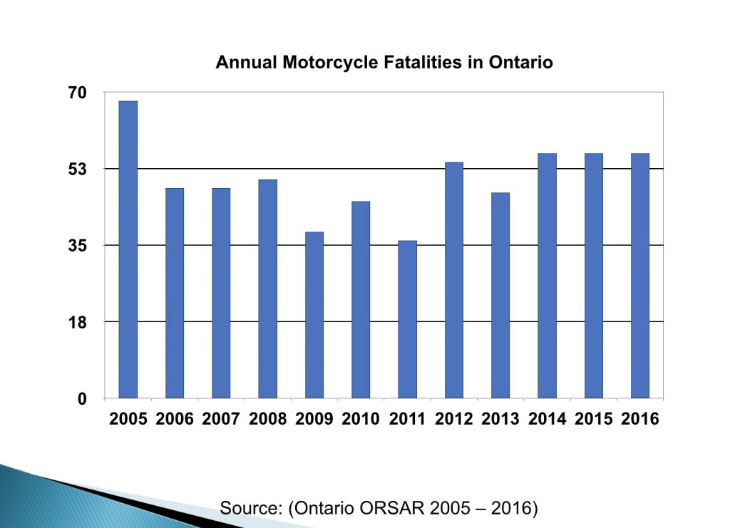 “In Ontario we are doing way better than ten years ago,” Marchand said, referring to statistics from Ontario Road Safety Annual Reports. Motorcycle fatalities in Canada in 2015 were significantly lower than the rates in 2005.