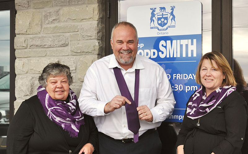 November 25th is the day International day for the Elimination of Violence Against Women. For the past four years, women’s shelters across the province, including Belleville’s Three Oaks Foundation, has been selling purple scarves to raise money for the prevention month. This is the first year where the local shelter has decided to sell and hand out purple ties to positive male figures within the community.