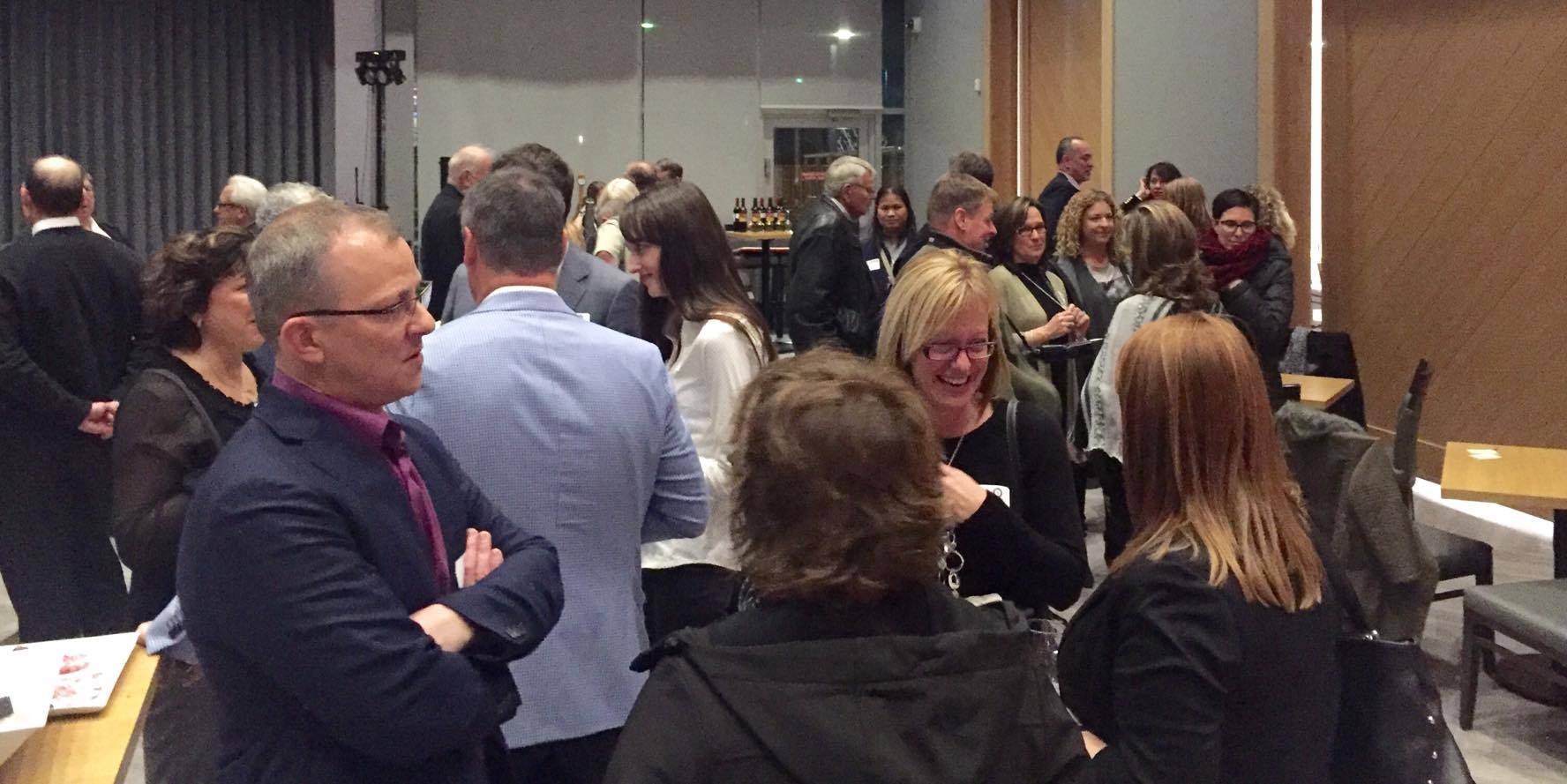 While enjoying desserts, cold cuts, cheeses and wine, business professionals mingled while making new contacts.