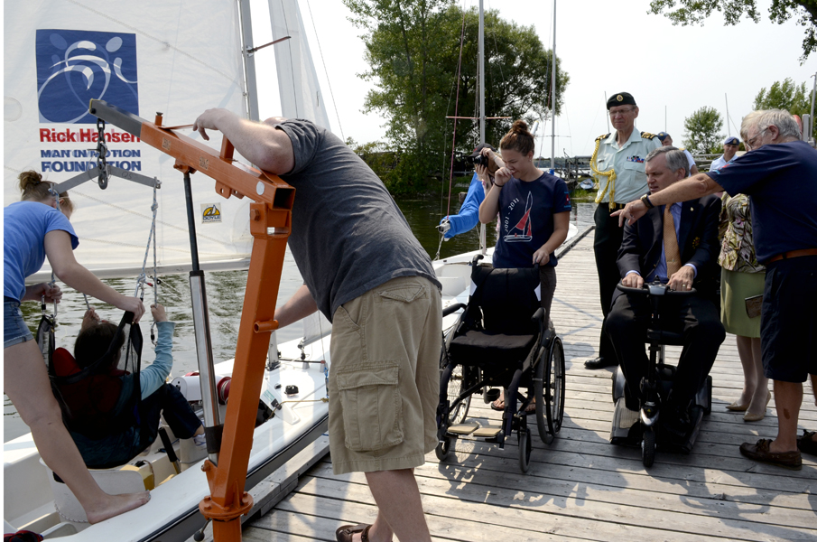 TRENTON ONT (19/07/2011) Fletch President and Co Founder of Quinte SailAbility points out how the lift is used to Ontario's Lieutenant Governor David C Onley. Onley was at the sailing school to celebrate its 10th anniversary. SailAbiltiy works to remove barriers and give disabled people a chance to sail on their own. Photo by Linda Horn