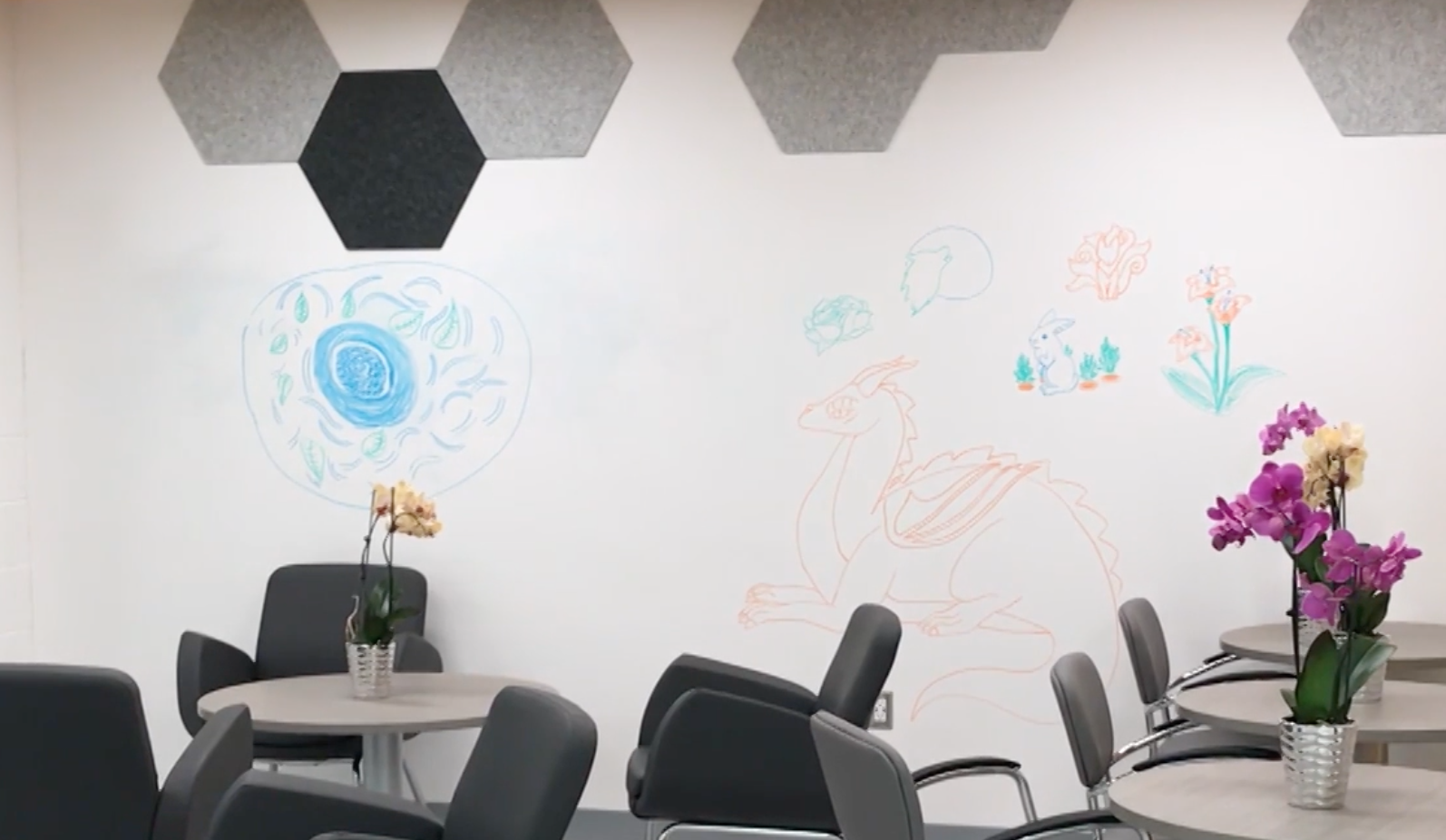 The following day the previously clean whiteboard walls were decorated with colourful drawings.