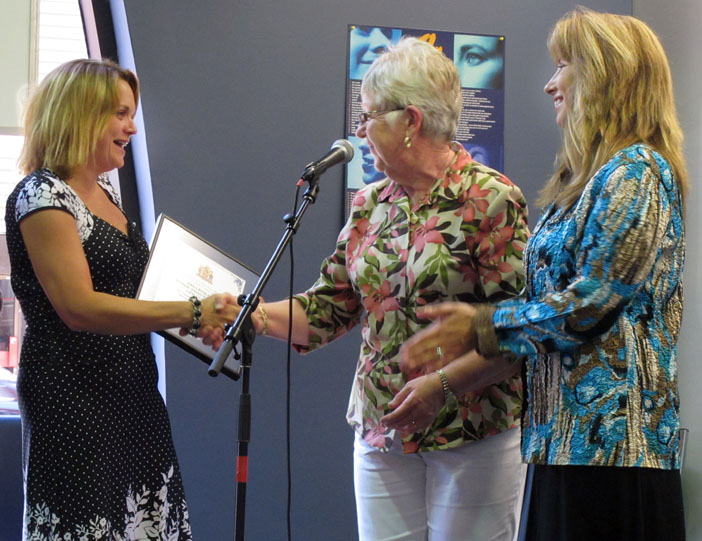 BELLEVILLE, Ont. (16/08/11) Tammy O'Rourke (left), clinical lead nurse practitioner at Belleville's first nurse practitioner-led clinic, receives a plaque from Pat Culhane (centre), registered nurse and city councilor, in honour of the clinic's one-year anniversary. Robin Ferguson (right), the clinic's administrative lead, helps accept the gift. Photo by Renee Rodgers.