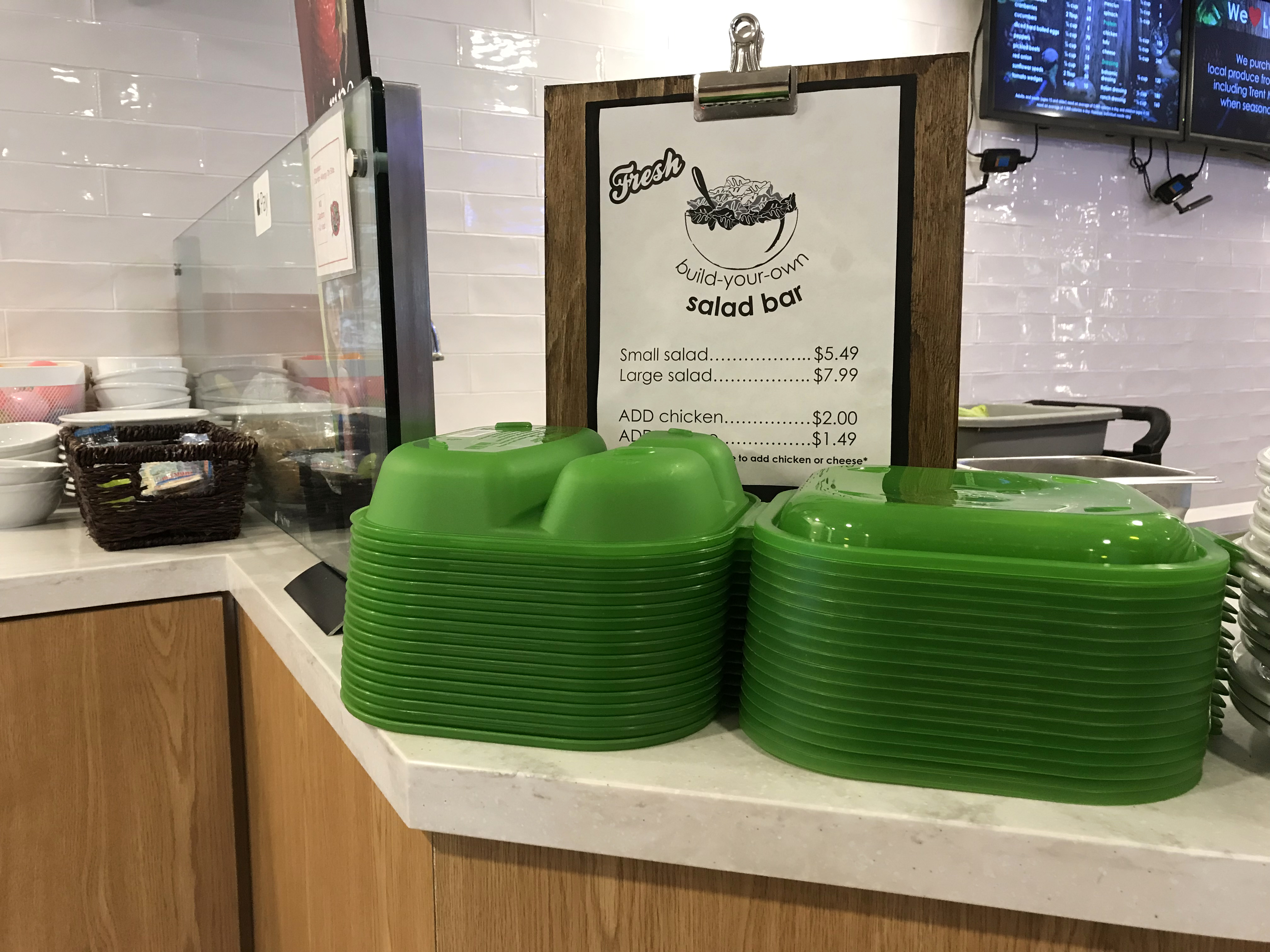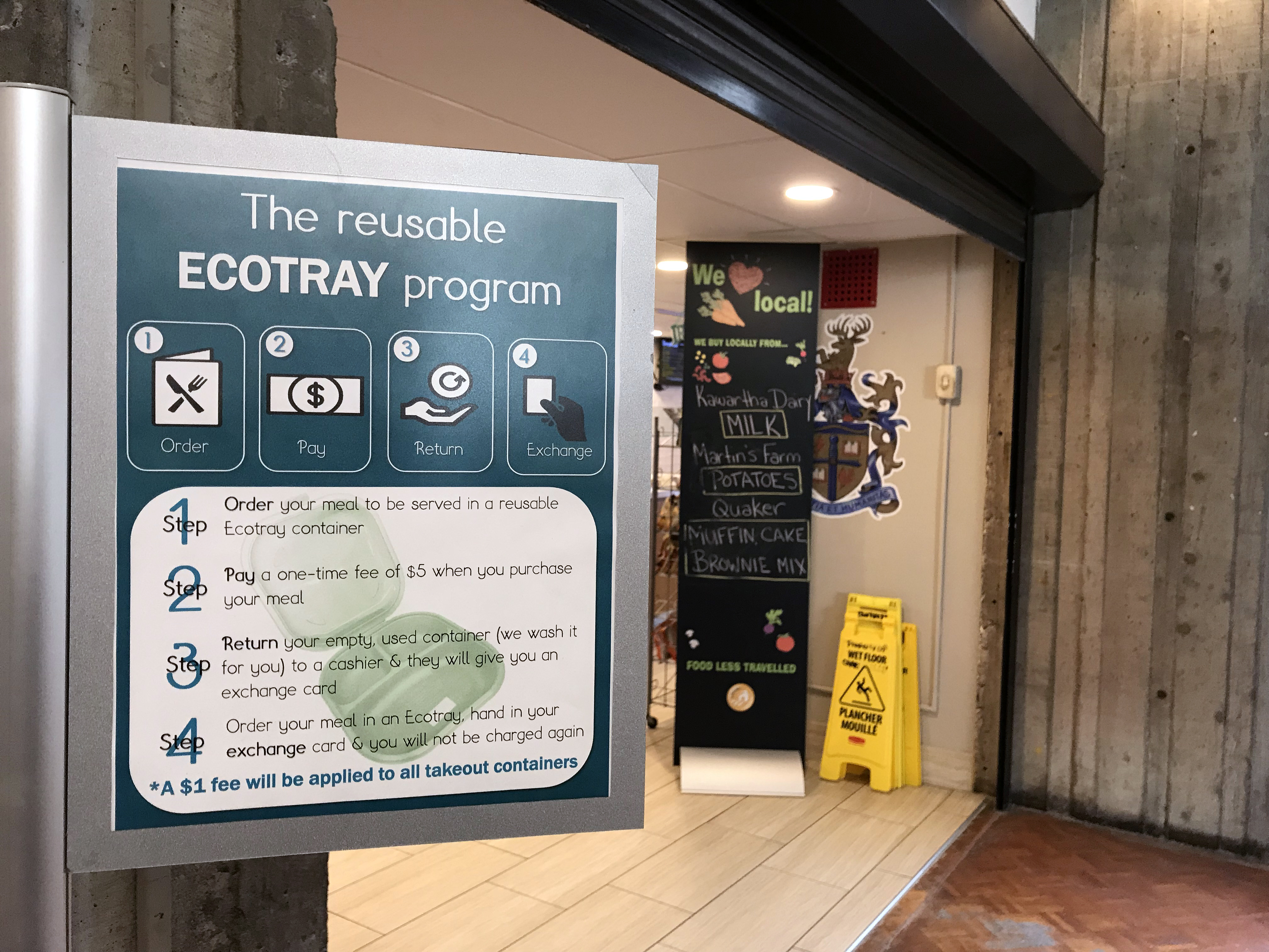The university’s cafeteria offers reusable and washable EcoTrays for a one-time cost of $5. (By comparison, students pay $1 each time they get a traditional take-away container.) Students return the EcoTray to get it washed, and receive an exchange card so they can get another one free the next time they eat. The program was introduced about four years ago.
