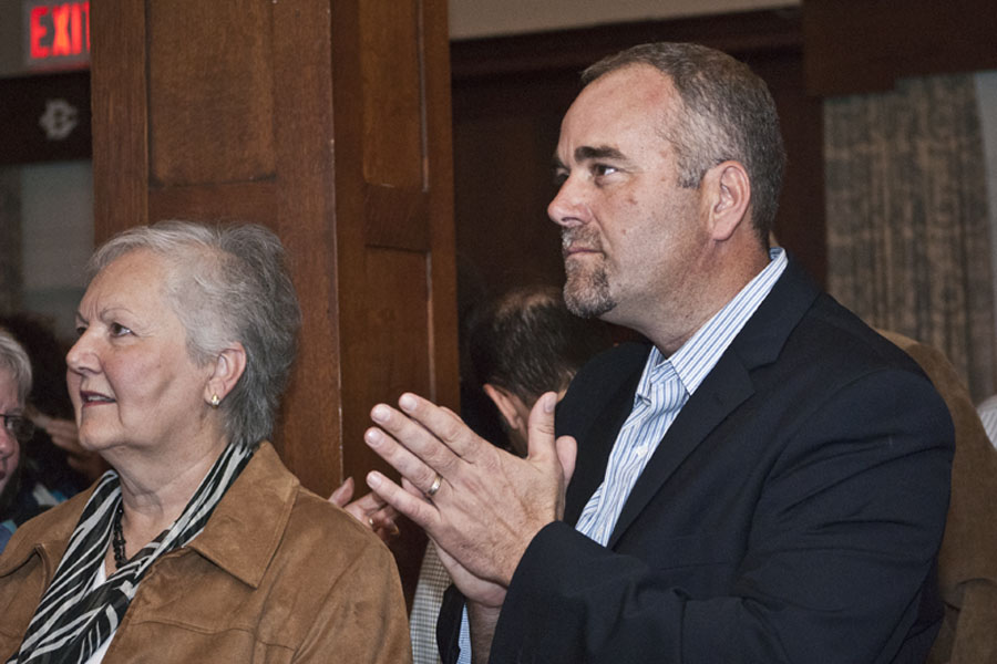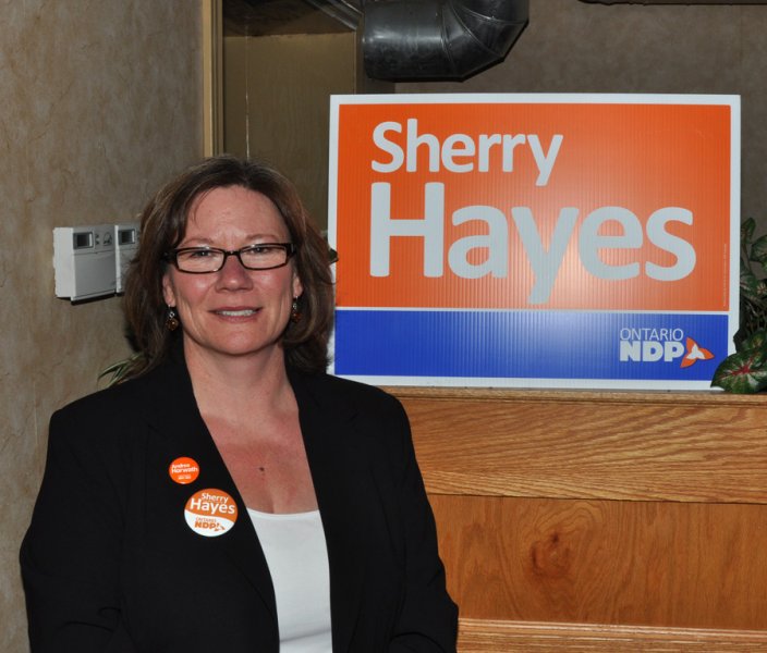Defeated NDP candidate Sherry Hayes gave congratulations to newly elected Conservative MPP Todd Smith at the Belleville Club. Photo by Ashliegh Gehl.