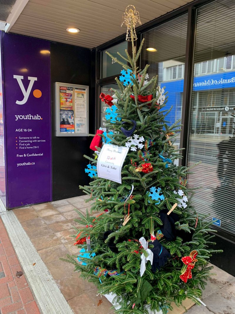 The Give and Take Tree is a Christmas tree outside of the downtown Belleville offices of Youthab, a non-profit organization that serves youth in the Quinte area. It’s decorated with warm items of all sizes and personal hygiene products for anyone in need to take during the cold season.