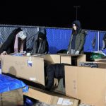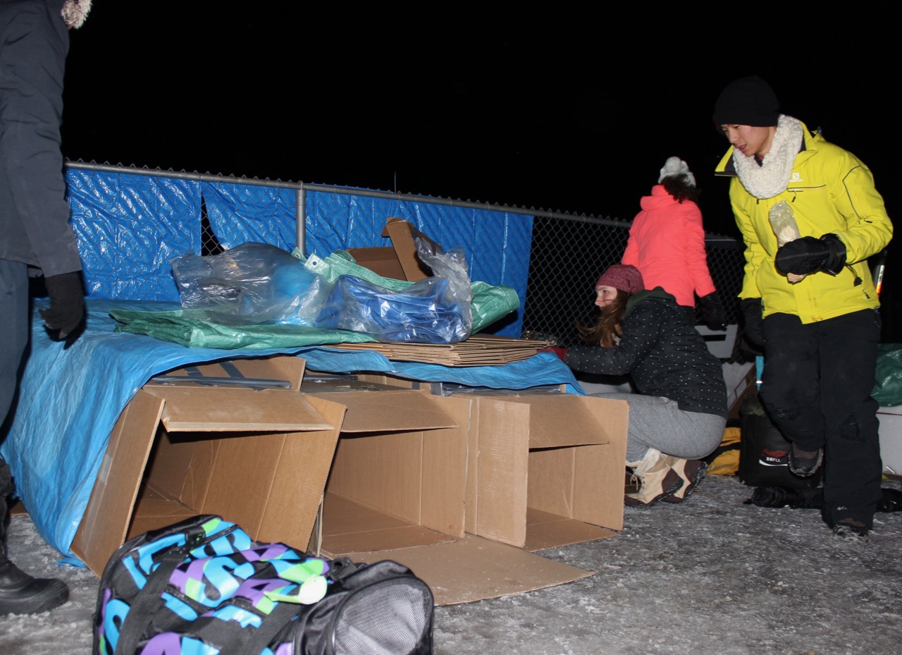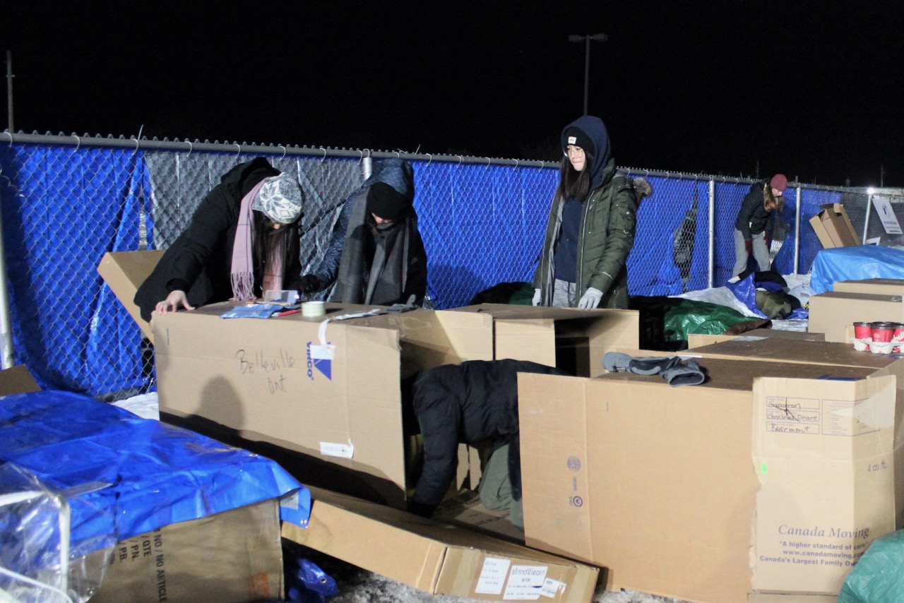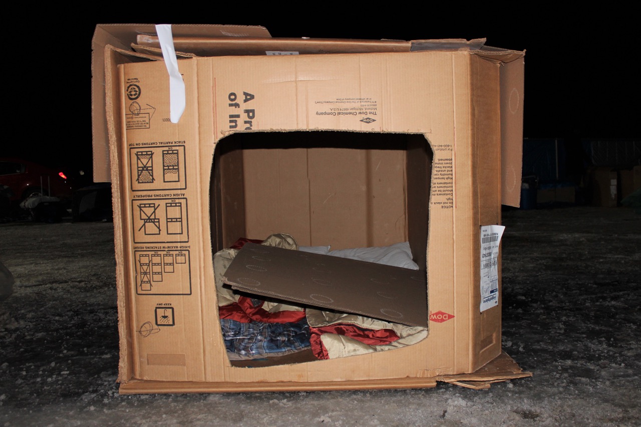 Snuggled in blankets and sleeping bags inside duct-taped cardboard boxes in a snow-covered parking lot, community members spent 12 hours in the cold to raise money and awareness about homelessness. The temperature reached a low of -9 C with a windchill of -16 C.