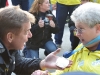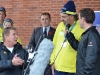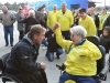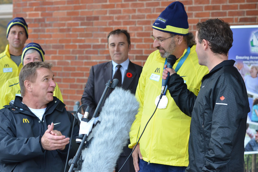 Rick Hansen listens to and applauds medal-bearer Harold Cliff Andrews at a short ceremony at Market Square Monday.