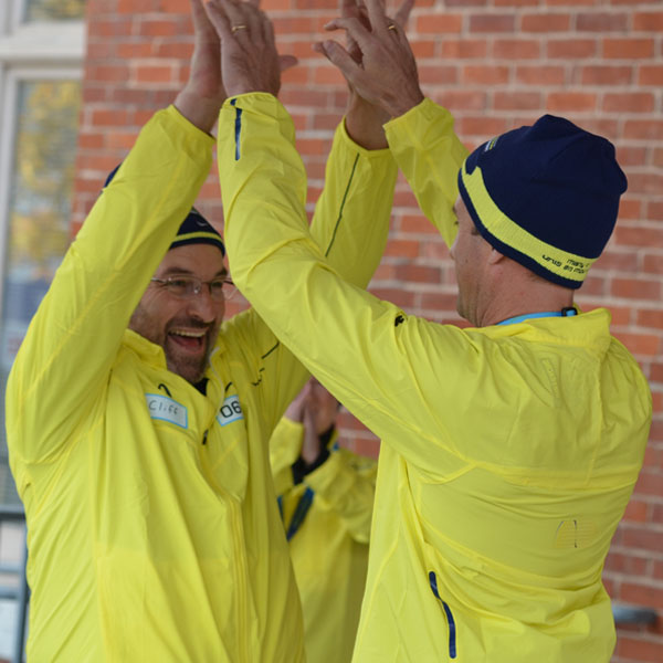 Medal bearers Harold Cliff Andrews and Jeff Lay celebrate with a high five after their leg of the relay at Market Square Monday afternoon.