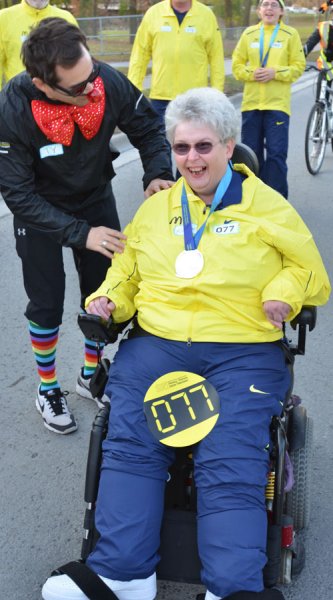 Karen Kitchen was the final medal bearer in Belleville's Rick Hansen relay. She wheeled the medal into the Quinte Sports Center and right up on stage where she said Hansen was 'one of her idols'. Kitchen serves on Belleville's Accessability Advisory Committee.