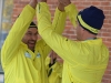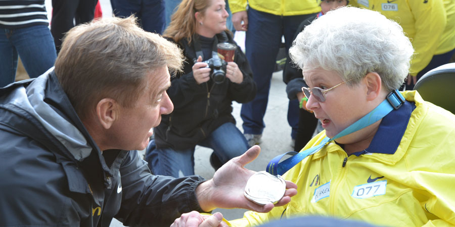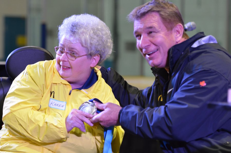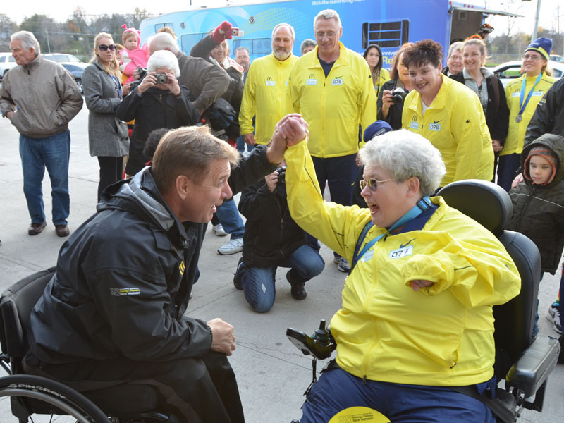 Rick Hansen celebrates the end of the Belleville relay with final medal-bearer Karen Kitchen outside of the Quinte Sports Center. Kitchen was born with Cerebral Palsy, and has dedicated countless hours to making Belleville more accessible.