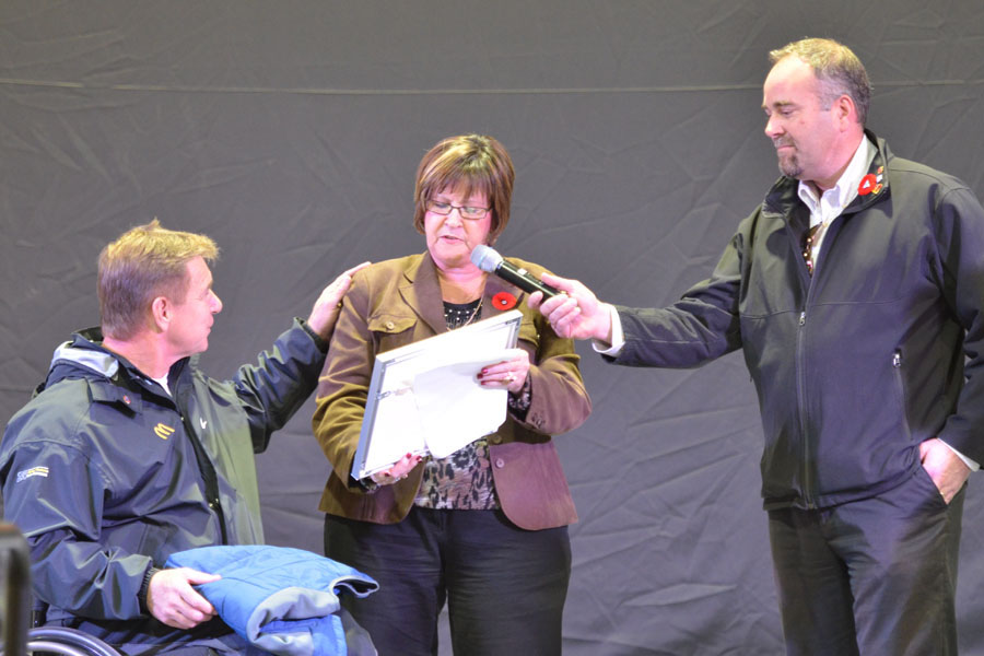 Rick Hansen, left, listens to Jo-Anne Albert and Todd Smith on stage at the Quinte Sports Center.