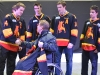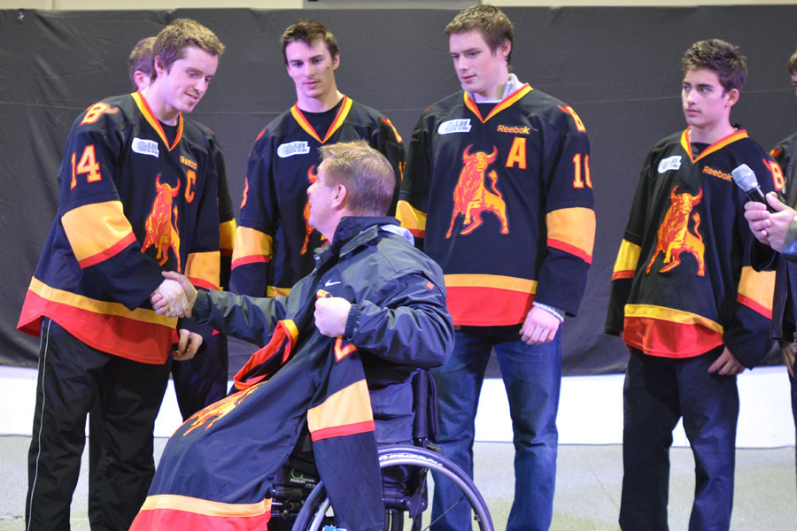 Belleville Bulls captain Juke Judson shakes hands with Rick Hansen after presenting Hansen with his own Bulls jersey while Adam Payerl, Brendan Gaunce and Alex Carnivale look on.
