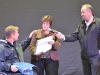 Karen Kitchen and Rick Hansen smile for the cameras with the relay medal on stage at the Quinte Sports Center.