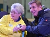 Rick Hansen welcomes final medal bearer Karen Kitchen to the Quinte Sports Center, holding her hand and congratulating her.