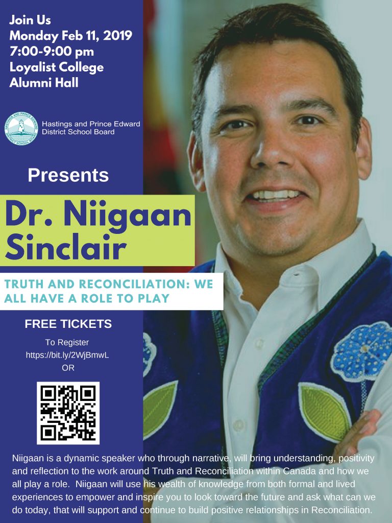 “Niigaan will use his wealth of knowledge from both formal and lived experiences to empower and inspire you to look toward the future and ask what can we do today that will support and continue to build positive relationships in reconciliation,” according to a news release from from the Hastings and Prince Edward District School Board, which has organized the event.