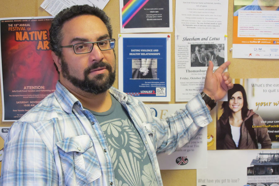 Paul Papadopoulos, TVNM professor at Loyalist College points to where he found a racist business card at the college on Thursday morning. Photo by Marc Venema.