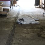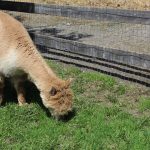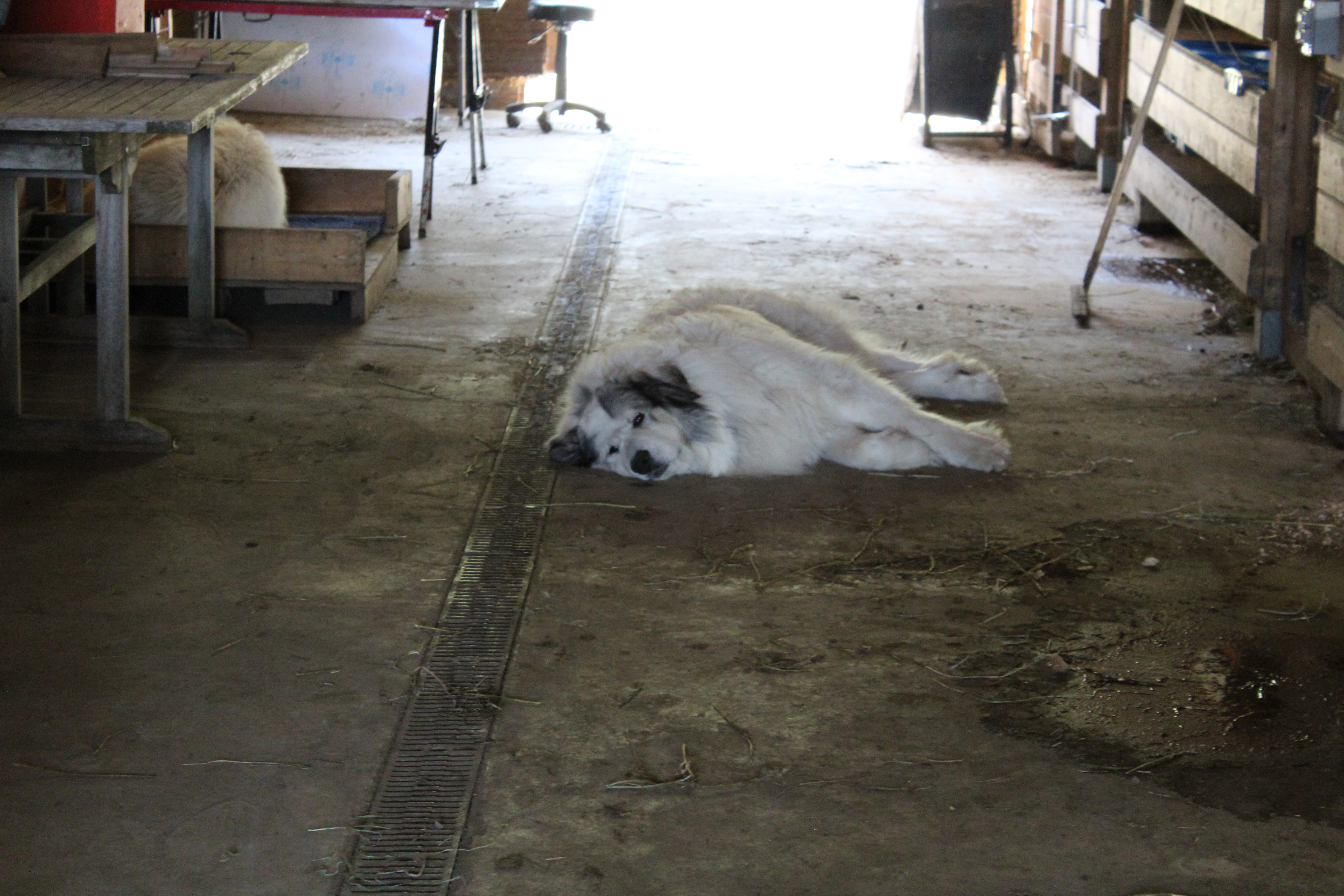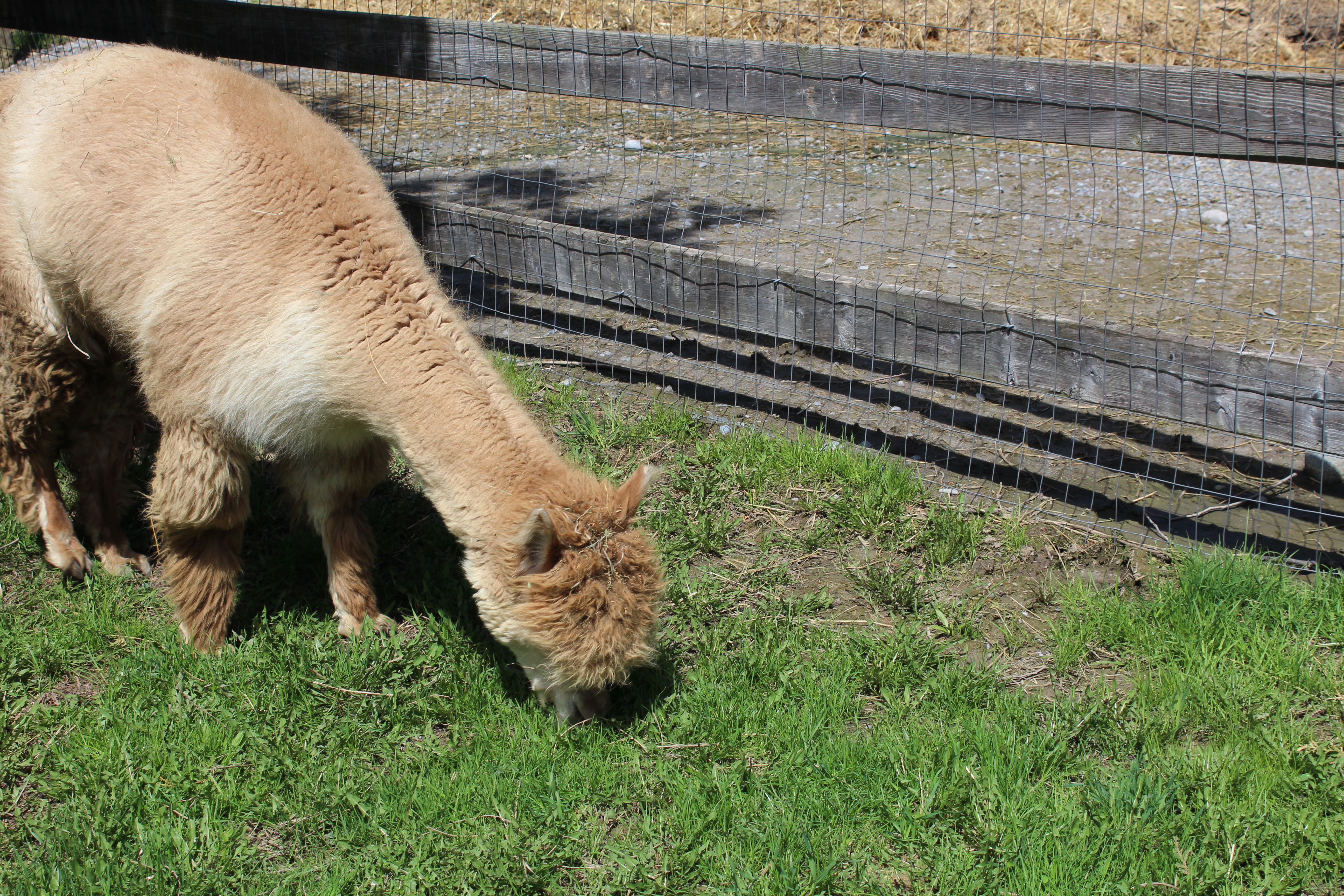 Past the bridge that sits over the creek, you can see the female and baby alpacas. There are three baby alpacas and two granny alpacas to watch over them. Across from them are more female alpacas eager to be let out to their pasture so they can eat the grass. Watching over them are Rita and Poppy, two more guard dogs.