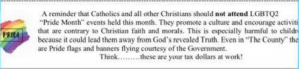 Last June, Chisholm drew widespread criticism from his parishioners, the Picton community and provincial Pride groups after calling on “Catholics and all other Christians” not to participate in Pride events:
