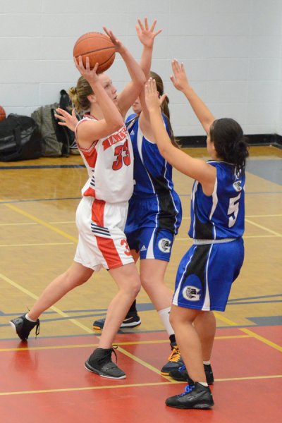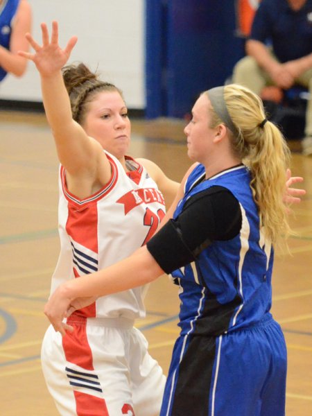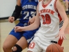Lancer's Sierra Cauley fends off Georgian's Megan Robertson (23) and Katie Wiggins (13) in Sunday's basketball action.