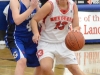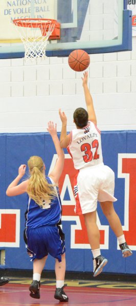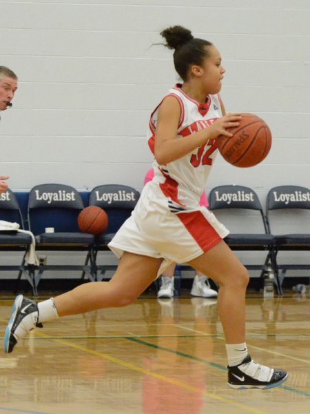 Loyalist Lancer Amber Burton charges for a basket in Sunday's basketball action. The Lancers won the game 56-39.
