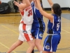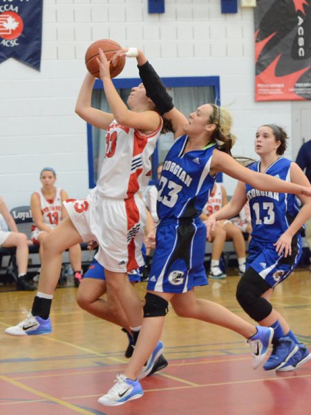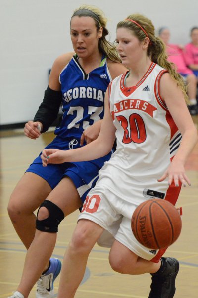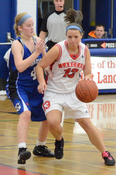 Lancer Jenni Thompson powers past Georgian's Megan Robertson in OCAA Basketball action on Sunday
