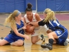 Loyalist's Amber Burton fights Grizzlies' Kara Faulkner (left) and MacKenzie Merkley (11) for the ball.