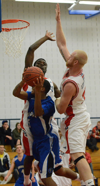 Loyalist Lancers Calvin Chevannes (back) and Mike Latchford (right) both jump to block a Georgian Grizzlies player during their first home game on Sunday. The Lancers fell 91-76. Photo by Christine Hosler
