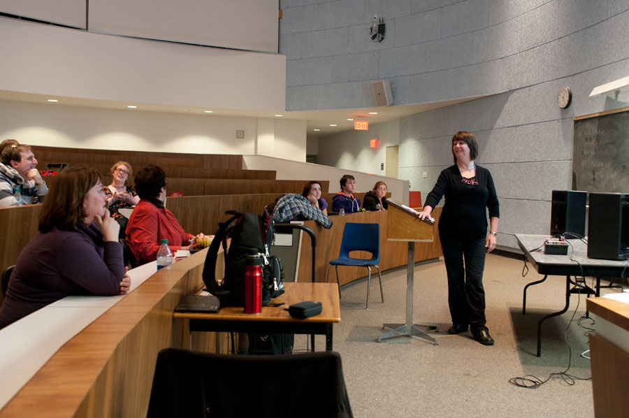 BELLEVILLE, ON (11/08/11) Loyalist Community Choir Director Cheryl Thrasher discusses song choices with a small selection of the group. The choir meets Monday nights from 5pm to 7pm in Wilkinson Lecture Hall. Photo by Keenan Weaver.