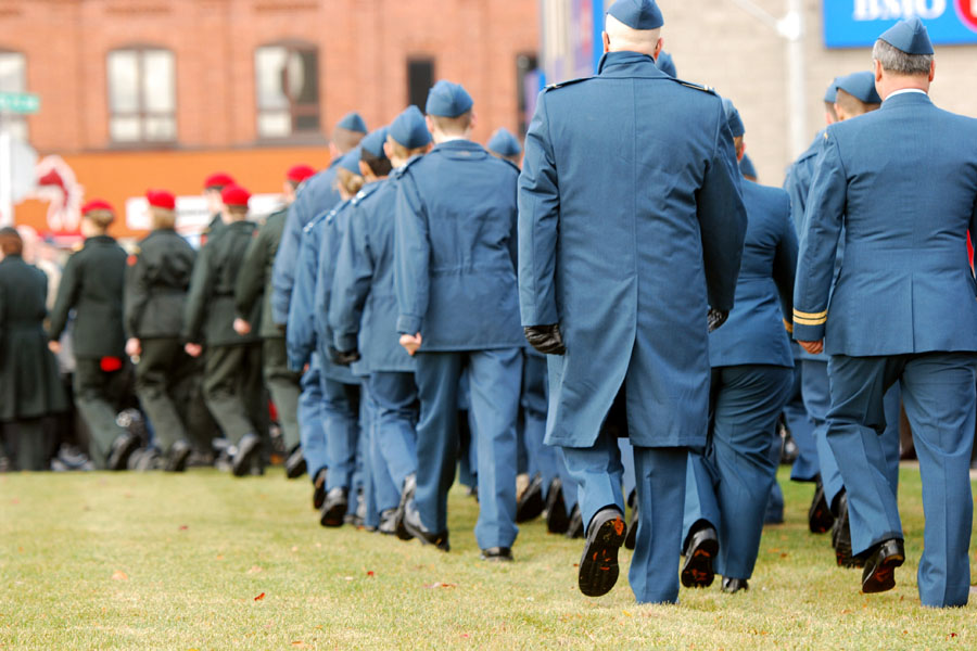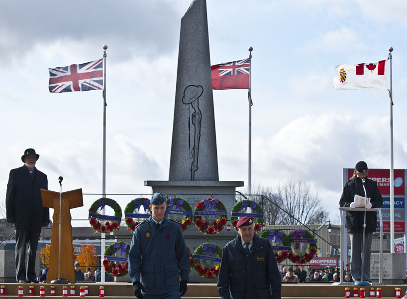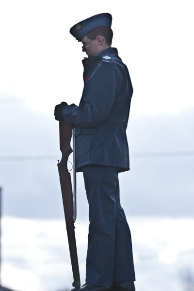 A cadet stands at the corner of the cenotaph in Trenton, Ontario, looking at the hundreds of people who came to the square to pay their respects. Photo by Ashliegh Gehl.