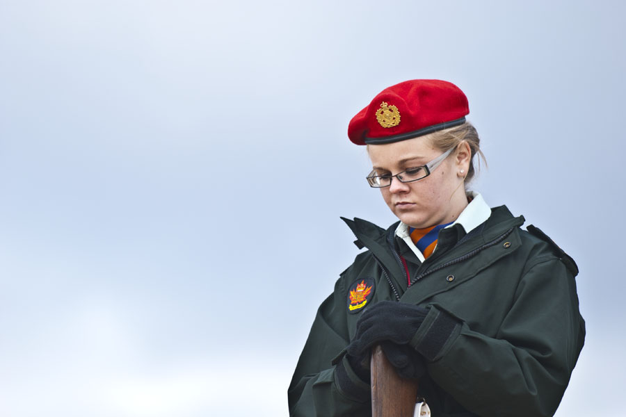 A cadet hangs her head during the two minute moment of silence at the Remembrance Day ceremony in Trenton, Ontario. Photo by Ashliegh Gehl