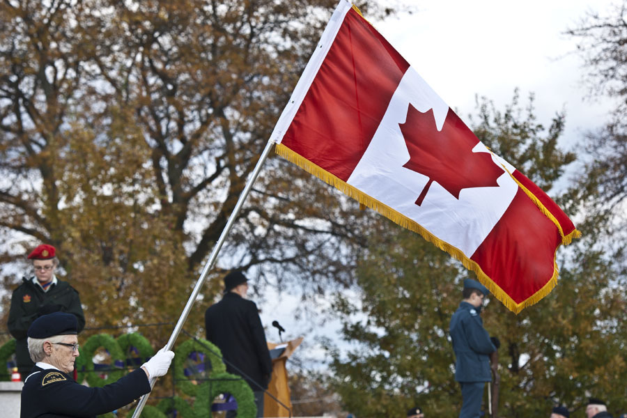 A woman marches with the Canadian flag errect during the Remembrance Day ceremony in Trenton, Ontarion. Photo by Ashliegh Gehl.