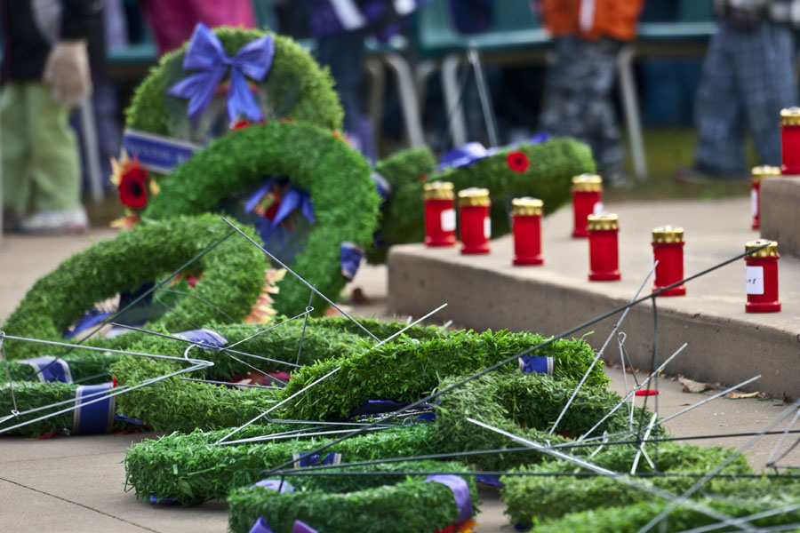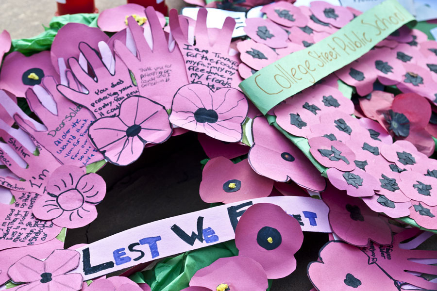 Wreathes made by school children rest at the base of the cenotaph in Trenton, Ontario. Photo by Ashliegh Gehl.