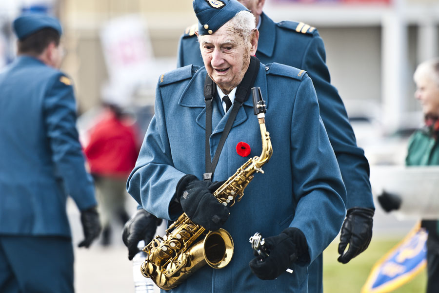 A saxophone player with instrument and stand in hand walks away from the cenotaph in Trenton, Ontario, on Friday after playing music for the Remembrance Day ceremony. Photo by Ashliegh Gehl.
