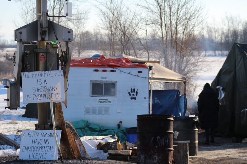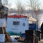 As of Wednesday afternoon there were two camps. One on Wyman Road had about 20 protesters alongside the tracks. There were two tents and two Mohawk flags, as well as a sign saying “RCMP get out.” Protesters were standing around a fire in a metal bin and milling about the campsite. Reporters from several news outlets were also on the scene.