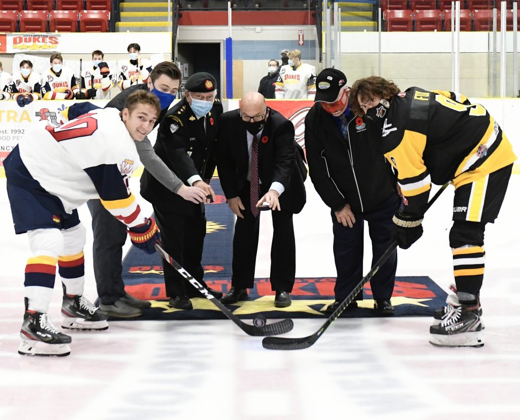 Game One of the Hasty P’s Cup on Wednesday resulted in a 2-2 tie as the Wellington Dukes renew their rivalry with the Trenton Golden hawks in the 8 game series. Wellington Captain Ben Woodhouse, Trent Valley Distributors Owner and former Dukes Chris Auger, Hasty P’s Hon Col. Bob Graydon, PEC Mayor Steve Ferguson, QW Mayor Jim Harrison and Trenton Captain Griffen Fox (Photo: Andy Corneau/OJHL Images)