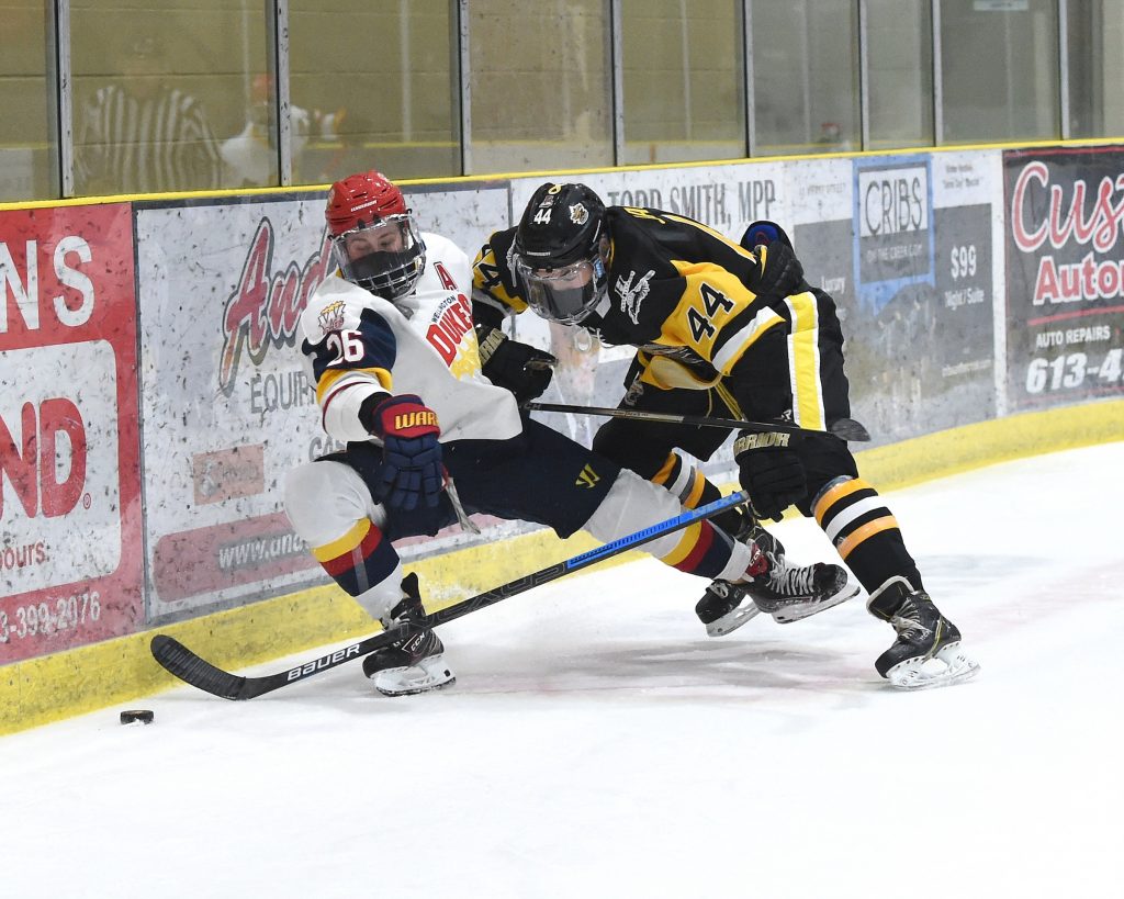 Ben Woodhouse #26 of the Wellington Dukes battles along the board with Julien Jacob #44 of the Trenton Golden Hawks during the second period (Photo submitted by Andy Corneau/OJHL Images)