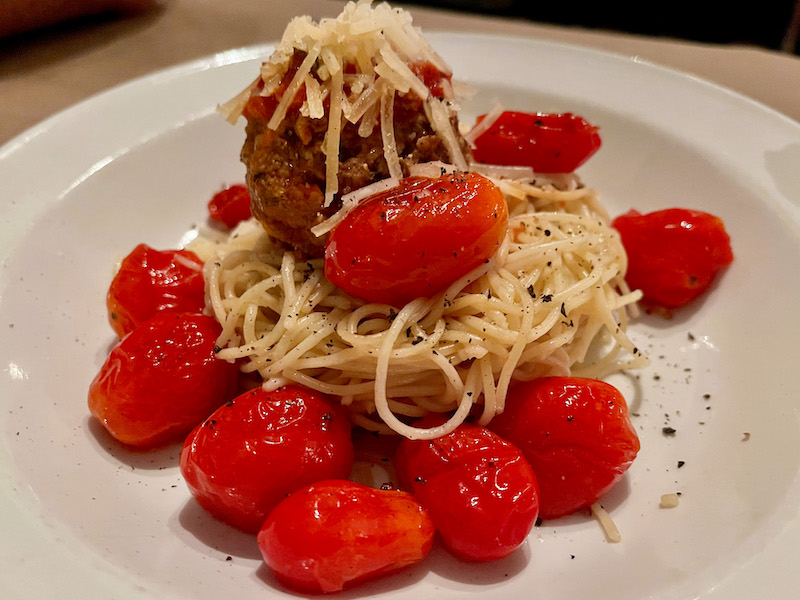 Appetizer: OSTRICH MEATBALL CAPELLINI | roasted tomatoes, fried basil. Ostrich's from the local business Struisvogel Ranch in Carrying Place.