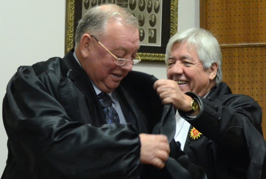 Judge Robert Scott puts the cloak of office on Hastings’ County’s new Warden, Terry Clemens, at the inaugural meeting on Thursday. Clemens, reeve of Marmora and Lakes, replaces Jo-Anne Albert as the warden. Some of the things he plans to continue are the doctor recruitment program, housing projects, and working to attract larger businesses to the area. Clemens was also the County’s Warden in 2007. Photo by Jennifer Bowman