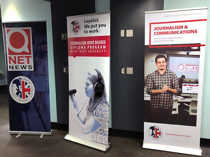 QNet News, Trent-Loyalist and journalism and communications banners in the hallway of the newsroom.
