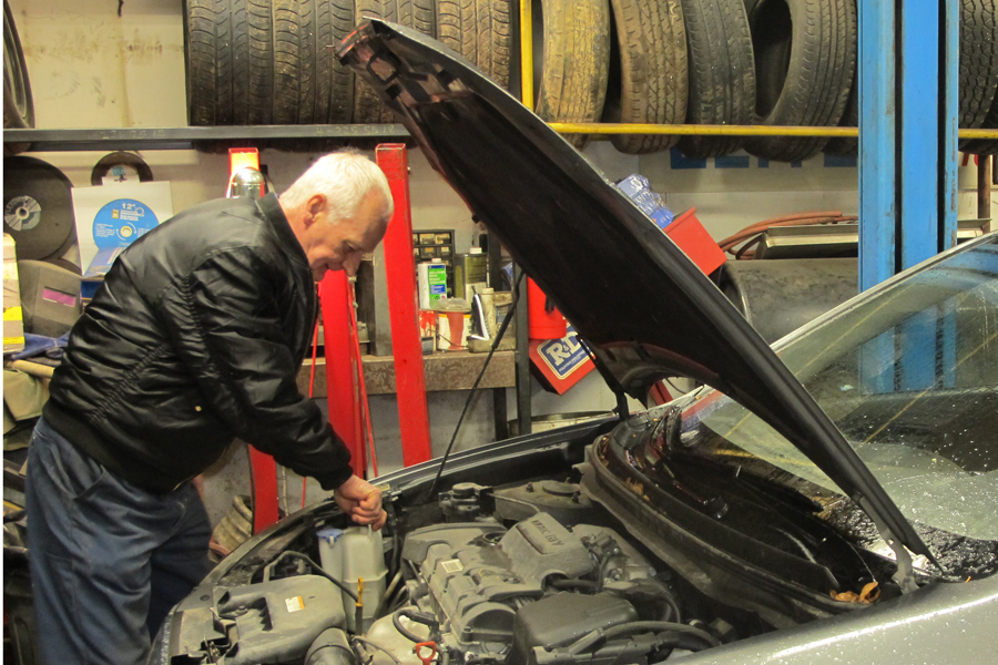 Local mechanic Bob Prud'Homme services a vehicle brought in Monday afternoon. His main piece of advice for motorists preparing their vehicles for winter: Stick to the maintenance schedule. Photo by Kurt Weiss