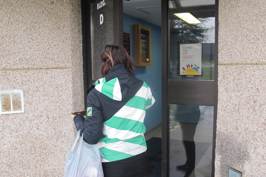 Kerri Reid, a first year Esthetics and Spa Management student, enters Residence Building D, where she lives. Photo by Taylor Renkema
