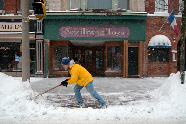 BELLEVILLE, ON (1/13/2012) — Richard Belanger clears an entrance to his store, Scallywag Toys, in Belleville Friday afternoon. Snow flurries delivered 10 centimetres of snow, requiring many storefront owners to hit the streets with their shovels. Belanger enjoys this weather, “It’s the time of year we’re supposed to have snow!” (Photo by Mark Tarnovetsky)