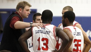 BELLEVILLE, ONT. (20/01/12) - Rich Whitfield, head coach of the Loyalist Lancers, offers encouragement to his team, Friday, Jan. 20th, against the Durham Lords. The Lancers, who are currently ranked 8th in the East Region, lost the game 91-71. Photo by Rebecca Rempel.