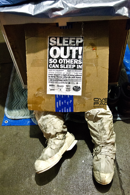 BELLEVILLE, ON (01/28/2012) Stan Hart prepares his box for the Sleep Out! So Others Can Sleep In a fundraiser on Jan. 27, 2012. Participants stayed over night in Belleville's Market Square to raise money for local homeless shelters. Photo by Dan Pearce.
