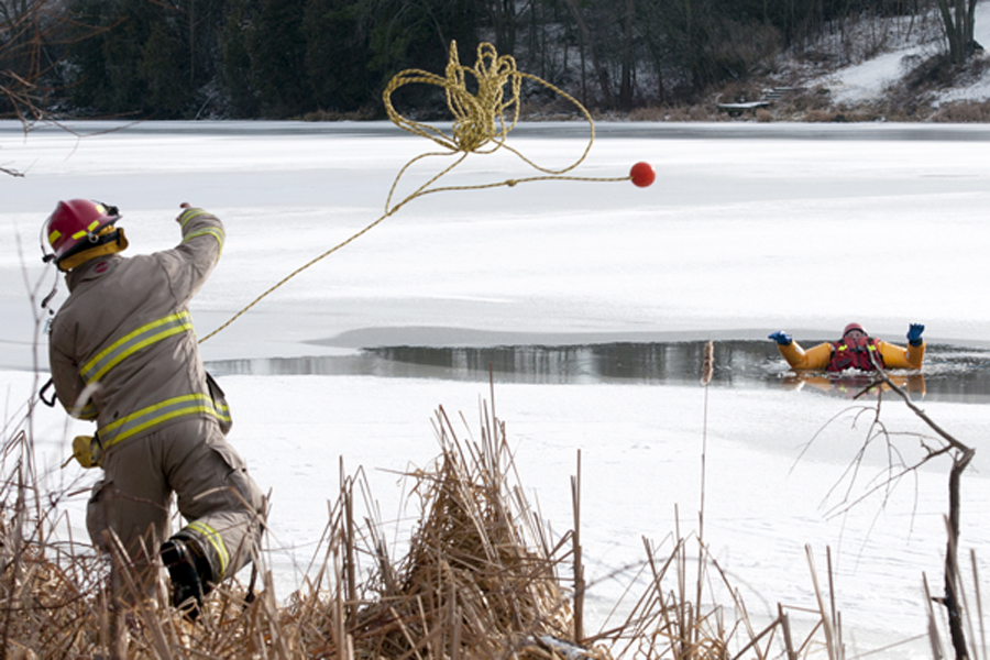 NAPANEE, Ont. (28/01/12) – A member of the Fire Service’s Specialized Rescue Team throws a rope to a team member during their annual ice and water training Saturday morning on the Napanee River. Members of the 12 person team went through several drills for the first time this year in order to train four new members and go over past training. The practice seemed increasingly important as just last week, two snowmobilers were rescued from the Bay of Quinte, about a week after the Sophiasburgh ice rescue team did their own training on the water. Photo by Melissa Murray.